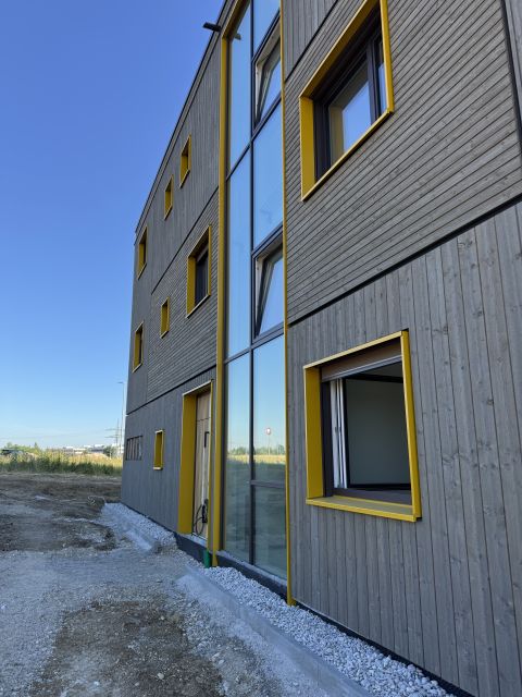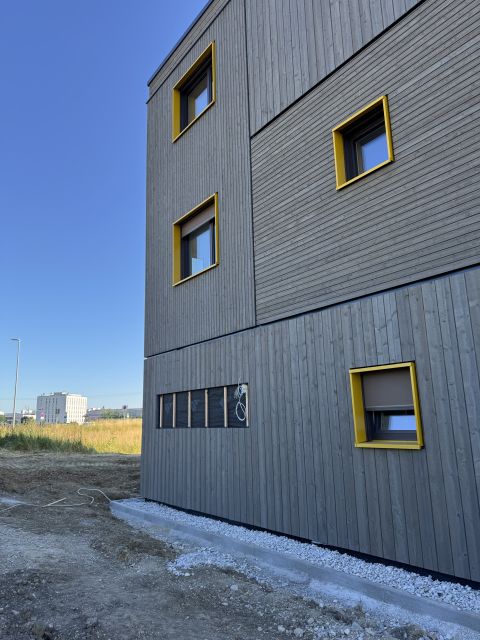 Das Gebäude zeichnet sich durch eine sogenannte Hybridbauweise aus. Dabei besteht die tragende Konstruktion des Gebäudes (Innenwände und Geschossdecken) aus Stahlbeton, während die Außenfassade in Holzbauweise gefertigt wurde.